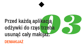 Przed każdą aplikacją odżywki do rzęs trzeba usunąć cały makijaż. Szczególną uwagę należy skupić na powiekach, rzęsach i brwiach. Resztki kosmetyków, które zalegają między rzęsami lub na skórze, mogłyby blokować przenikanie składników odżywczych do mieszków włosowych i cebulek rzęs. Tym samym rzęsy nie zostałyby wydłużone, zagęszczone lub wzmocnione. Ponadto pozostałości makijażu mogłyby wywołać podrażnienia oczu lub skóry powiek.